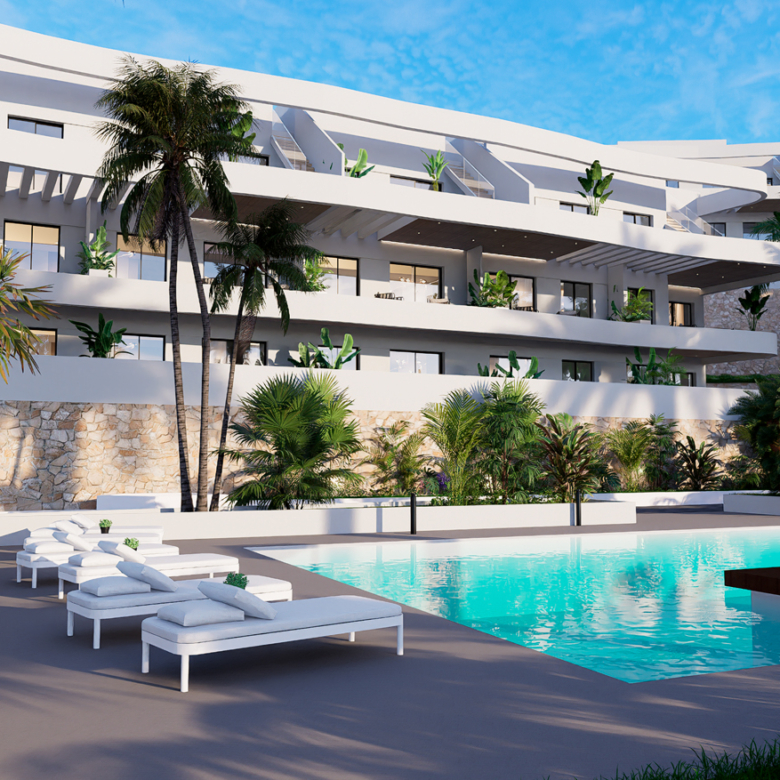 Spaanse DroomCasa presenteert u dit appartement met twee slaapkamers en twee luxe badkamers. Uw appartement is gelegen op de begane grond of eerste verdieping en beschikt over een ruim terras met zicht over de gemeenschappelijk tuin. Afhankelijk van de ligging heeft u fantastisch uitzicht op de tuin én ook op de Middellandse Zee.