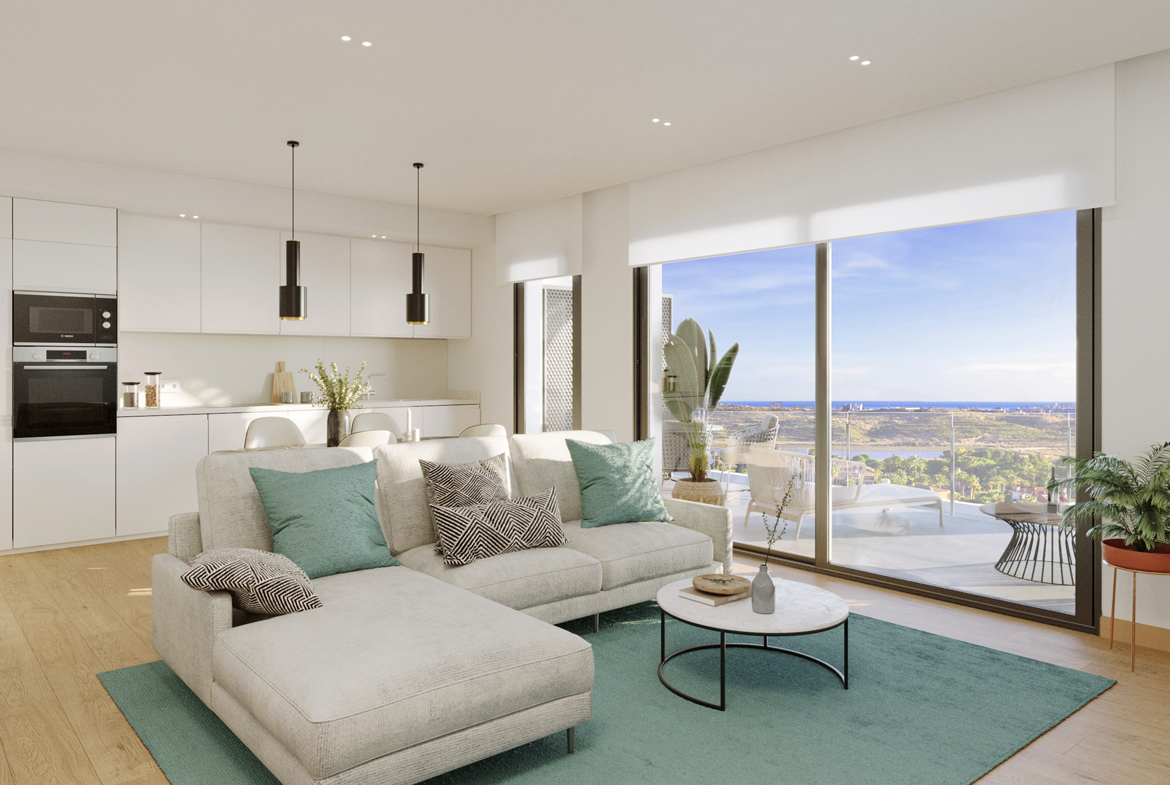 Spaanse DroomCasa presenteert u dit moderne en luxe appartement met drie slaapkamers, twee badkamers en zeer ruim zeezicht terras. De woonkamer is voorzien van een moderne keuken en grenst aan een ruim terras met uitzicht over de prachtige golfbaan richting de Middellandse Zee. De keuken is voorzien van een oven, keramische kookplaat, afzuigkap en beschikt over ruime kasten en lades en LED-verlichting.