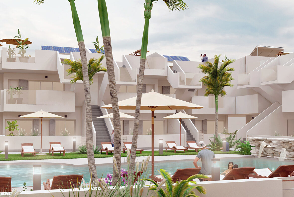 De residentie nodigt uit tot een betoverende ervaring, met een schitterende gemeenschappelijke tuin compleet met een sprankelend zwembad en een serene waterval. Rondom het zwembad wacht een uitnodigende ligweide, perfect om te genieten van de warme Spaanse zon. De tuin is prachtig ingericht met kunstgras en majestueuze palmbomen. Daarnaast kunt u zich laten inspireren in de buitengym en is er een geweldige speeltuin voor de kinderen om hun fantasie de vrije loop te laten.