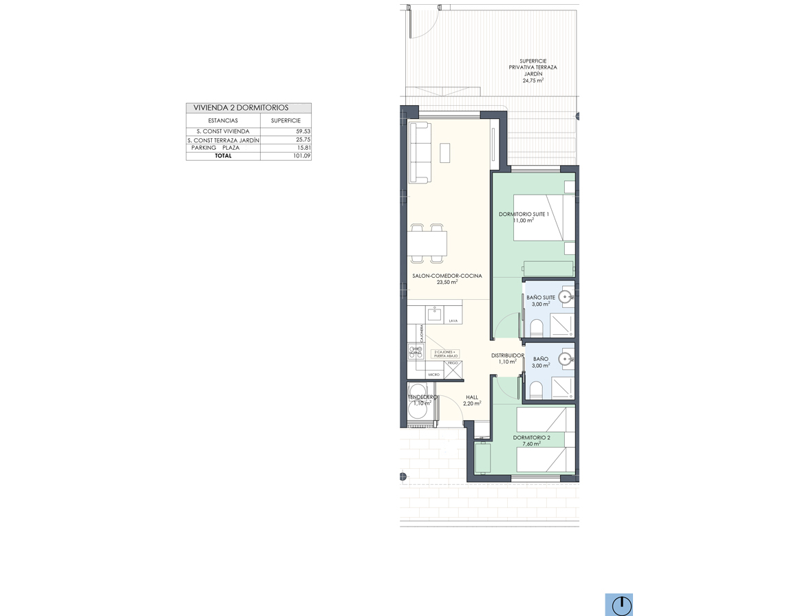 Spaanse DroomCasa presenteert u dit appartement op de begane grond met twee slaapkamers, twee badkamers en een ruim terras. De woonkamer loopt over in de open L-vormige keuken. Vanuit de woonkamer heeft u directe toegang tot het terras. De hoofdslaapkamer beschikt over een luxe badkamer en-suite. Beide badkamers zijn compleet met inloopdouche, badmeubel, spiegel en toilet.