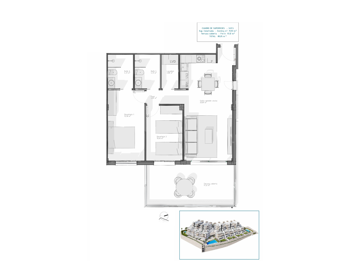 Spaanse DroomCasa presenteert u dit prachtige appartement met twee slaapkamers, twee complete badkamers en een ruim terras, perfect voor het creëren van onvergetelijke momenten. De uitnodigende woonkamer loopt naadloos over in de L-vormige witte hoogglans keuken, voorzien van een elegant grijs werkblad en sfeervolle LED-strips onder de kastjes. Hier vindt u hoogwaardig geïntegreerd witgoed: een koelkast met vriezer, inductiekookplaat, oven, magnetron, afzuigkap en vaatwasser, waarmee koken een plezier wordt. Bovendien is er een aparte afsluitbare ruimte voor uw wasmachine en droger, zodat alles overzichtelijk en georganiseerd blijft.