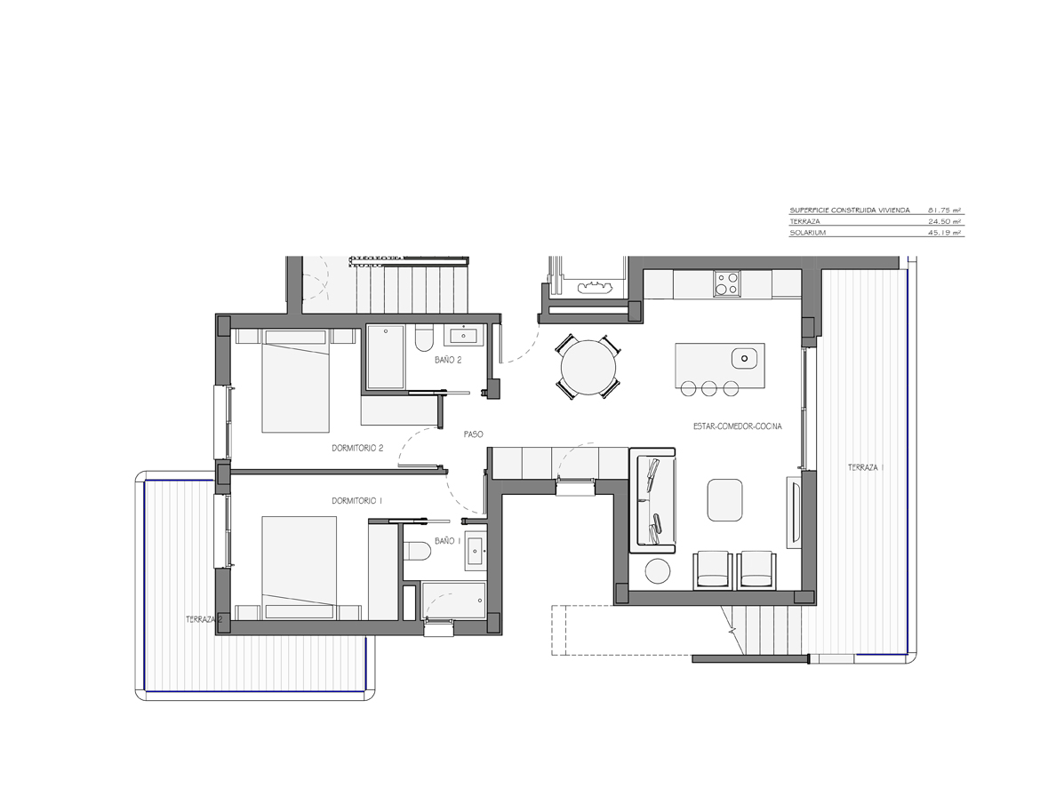 Spaanse DroomCasa presenteert u dit penthouse met twee slaapkamers, twee comfortabele badkamers, twee terrassen en een zonnig solarium. Uw penthouse ligt altijd op een hoek en het ontwerp is uitgevoerd in het wit stucwerk, gecombineerd met natuursteen. De woonkamer loopt naadloos over in de open keuken met een wit marmeren spoeleiland. De keuken is uitgevoerd in wit gecombineerd met beuken. Vanuit de woonkamer kijkt u uit over de gemeenschappelijke tuin met zwembad.
