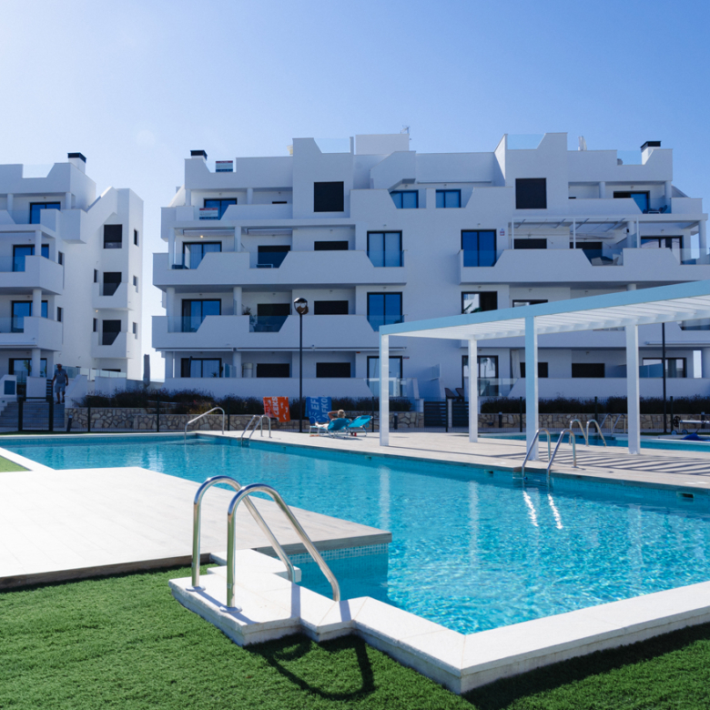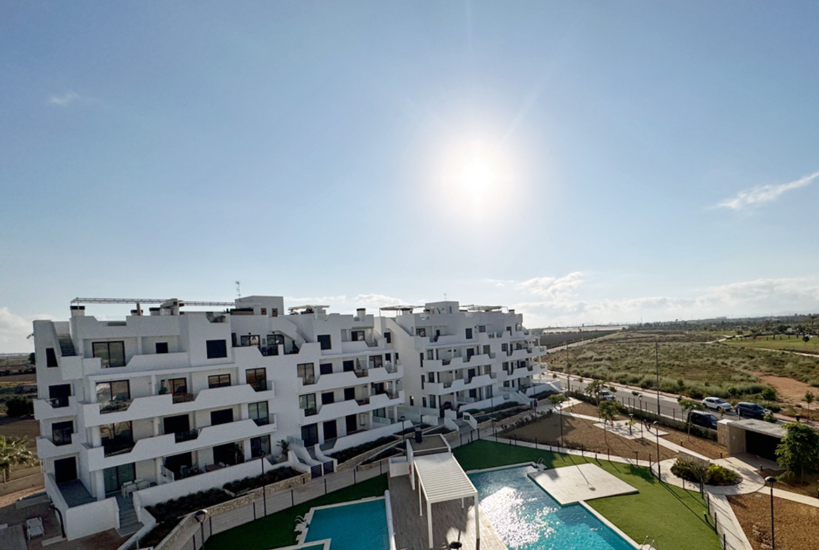 In deze prachtige residentie, waar uw droomwoning zich bevindt, heeft u de mogelijkheid om te genieten van twee schitterende gemeenschappelijke zwembaden, waarvan er één op duurzame wijze verwarmd wordt door zonnepanelen. Daarnaast is er een uitnodigende ligweide en een speeltuin voor de kinderen, perfect voor onvergetelijke momenten.