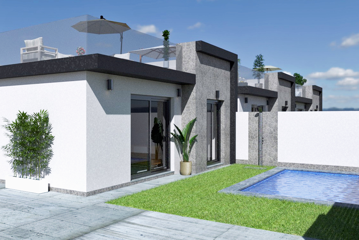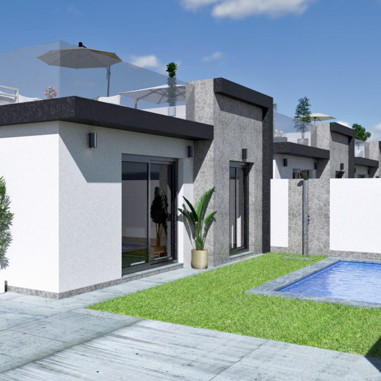 Spaanse DroomCasa presenteert u deze moderne gelijkvloerse villa met drie slaapkamers, twee complete badkamers, een privé zwembad en een zonnig solarium. De woonkamer, uitgerust met een strakke witte open keuken, is perfect voor gezellige avonden. Geniet van de geïntegreerde koelvries combinatie, vaatwasser, kookplaat, oven en afzuigkap in de keuken. Alle slaapkamers en badkamers bevinden zich op de begane grond, met de hoofdslaapkamer die beschikt over een luxe badkamer en-suite. Bovendien hebben alle slaapkamers directe toegang tot het prachtige terras rondom de villa. De twee badkamers zijn stijlvol ingericht met een inloopdouche, badmeubel, spiegel en toilet. Je villa is verder uitgerust met pre-installatie voor airconditioning en moderne LED-verlichting, zowel binnen als buiten. Maak dit prachtige huis uw thuis en ervaar de ultieme luxe en comfort.