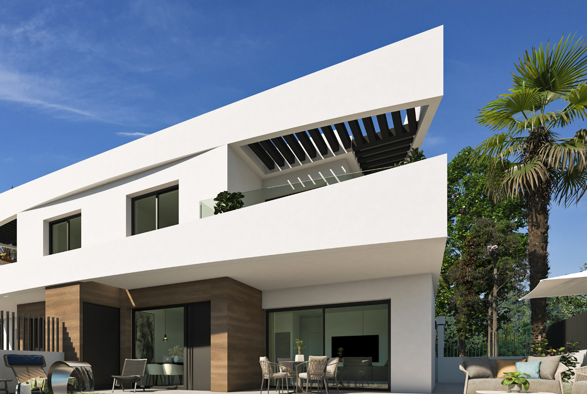 Spaanse DroomCasa presenteert u deze elegante schakelvilla met drie slaapkamers, drie luxe badkamers, gastentoilet en privé zwembad. Door het strakke design van wit stucwerk in combinatie met natuursteen geeft deze villa een exclusieve uitstraling. In de woonkamer beschikt u over een open keuken, welke is voorzien van een kookeiland en geïntegreerd Bosch witgoed. Vanuit de woonkamer heeft u toegang tot het terras met uw privé zwembad. Op de begane grond bevinden zich tevens een slaapkamer met luxe badkamer en-suit. Voor uw gasten is er een aparte toiletruimte aanwezig.