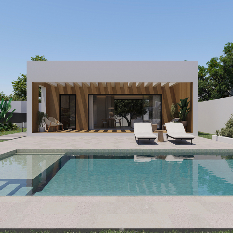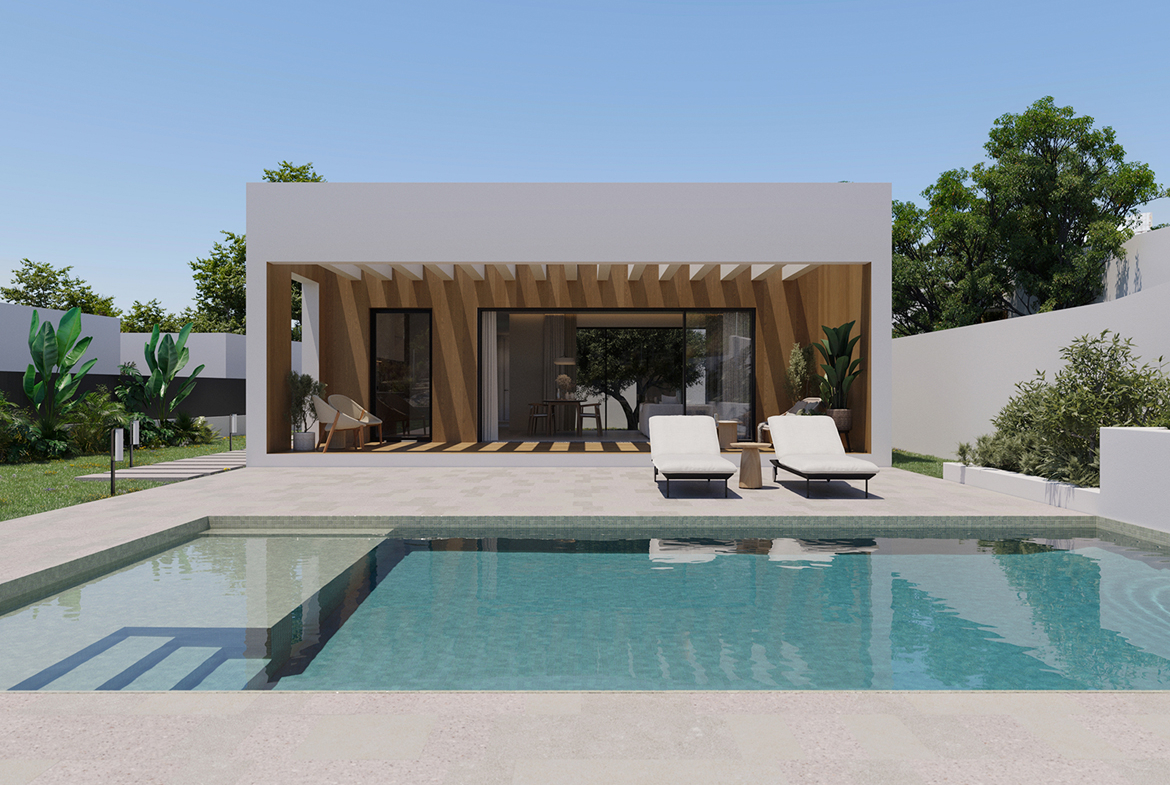 Spaanse DroomCasa presenteert met trots deze luxe vrijstaande designvilla, gesitueerd in het betoverende Finestrat. Deze unieke urbanisatie herbergt elegante vrijstaande gelijkvloerse villa’s, waar stijl en comfort samenkomen. Het strakke design, verrijkt met warme houtaccenten, zorgt voor een sfeer van verfijning. Uw villa is gesitueerd op een ruim perceel met drie slaapkamers, twee complete badkamers, een unieke patio en een adembenemende tuin. De woonkamer, voorzien van een schitterende open keuken met kookeiland dat uitermate geschikt is als eetbar, nodigt uit tot samenzijn. Een prachtige patio in de woonkamer brengt extra daglicht en groen binnen, waardoor een oase van rust ontstaat. Geniet vanuit uw lichte woonkamer van het panoramische uitzicht over uw idyllische tuin en het uitnodigende zwembad. Beide badkamers zijn luxueus en volledig ingericht voor uw comfort. De hoofdslaapkamer beschikt over een luxe en-suite badkamer, en daarnaast is er een apart gastentoilet aanwezig voor extra gemak.