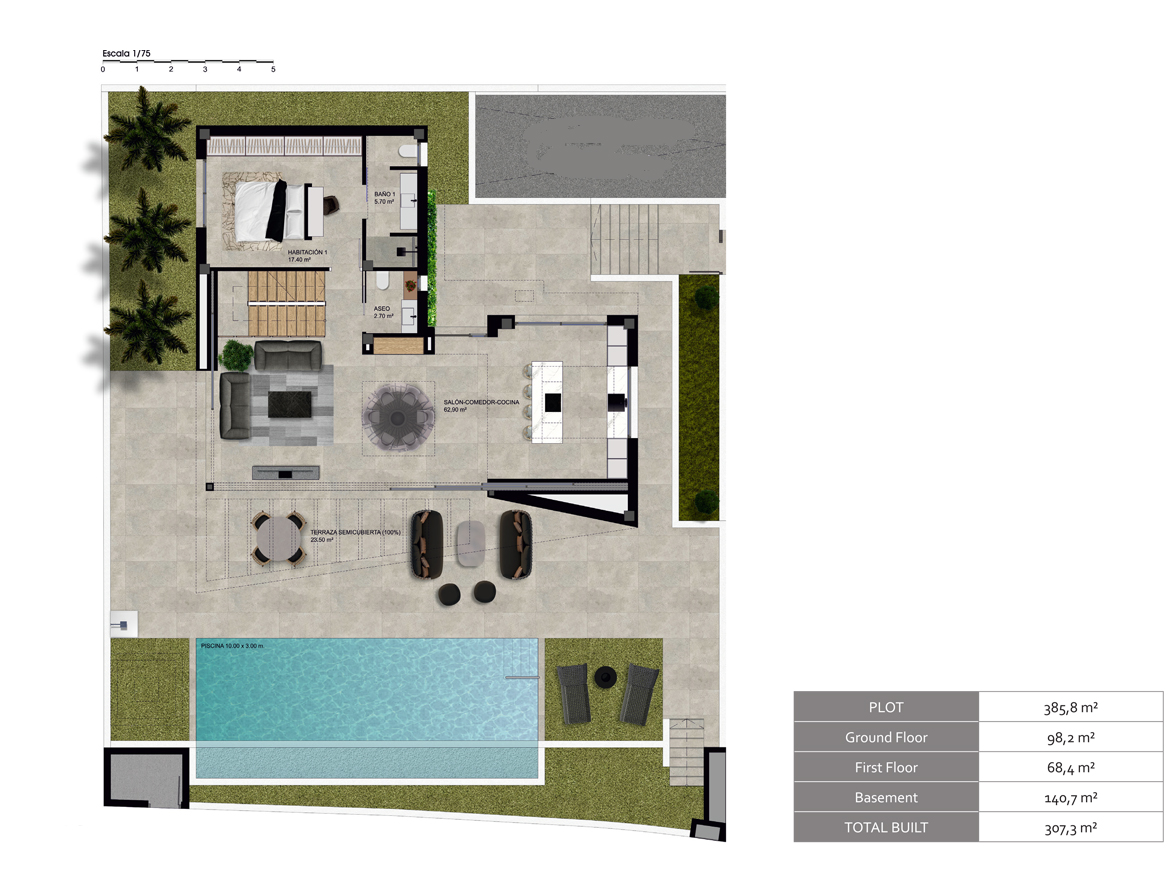 Uw villa biedt een ongeëvenaarde woonervaring met haar drie slaapkamers, drie complete badkamers en een uitgestrekt souterrain. De heerlijke tuin, compleet met een groot infinity zwembad, maakt dit de ideale plek om (semi) permanent te wonen en comfortabel thuis te werken. Vanuit de woonkamer geniet u van een adembenemend uitzicht door de hoge raampartijen over het glinsterende infinity zwembad.