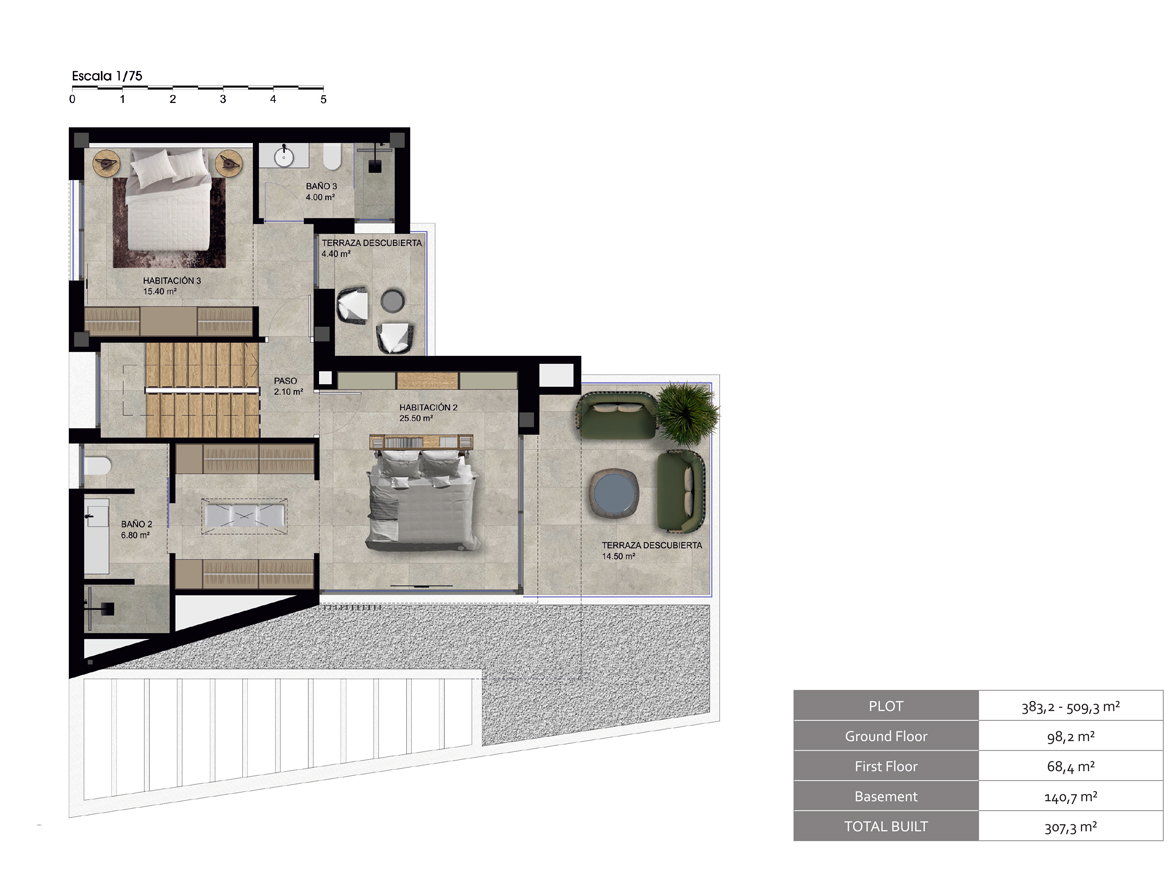 De hoofdslaapkamer op de eerste verdieping heeft de beschikking over een prachtig ingerichte inloopkast met LED-verlichting, een luxe badkamer en-suite en toegang tot een ruim terras met fantastisch uitzicht op de omgeving. De andere slaapkamer op deze verdieping beschikt ook over een terras en luxe badkamer en-suite. Uw drie design badkamers zijn compleet uitgevoerd met vloerverwarming, zwevend toilet, inloopdouche, luxe badmeubel, spiegel en LED-verlichting.