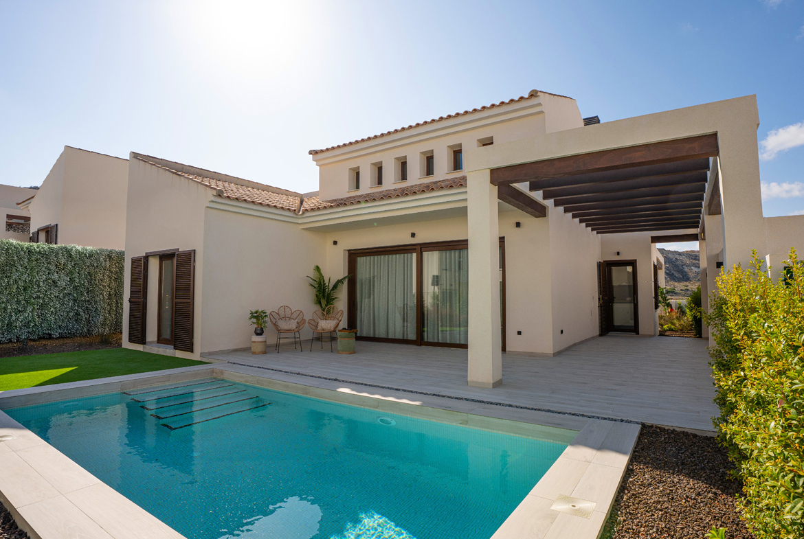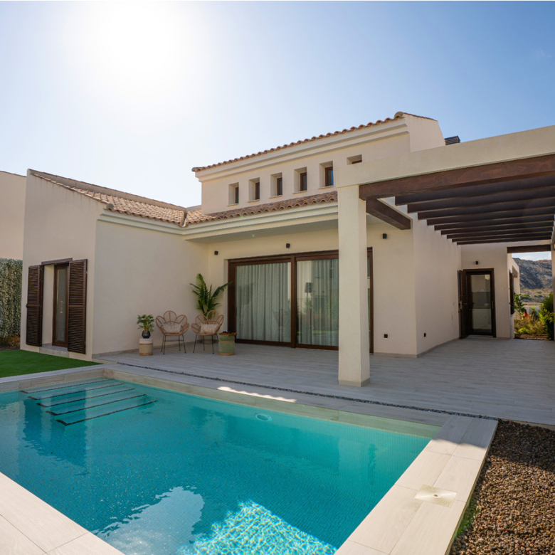 Spaanse DroomCasa presenteert u deze luxe, gelijkvloerse villa in mediterrane stijl met drie slaapkamers, twee luxe badkamers en een privé zwembad. De woonkamer loopt naadloos over in de open keuken met kookeiland. Deze kan ook als eetbar worden gebruikt. Er is een aparte wasruimte aanwezig met ruimte voor uw wasmachine plus droger. Dankzij het grote raam in de woonkamer heeft u een schitterend zicht op het terras, tuin en zwembad. In de tuin is een pergola aanwezig.