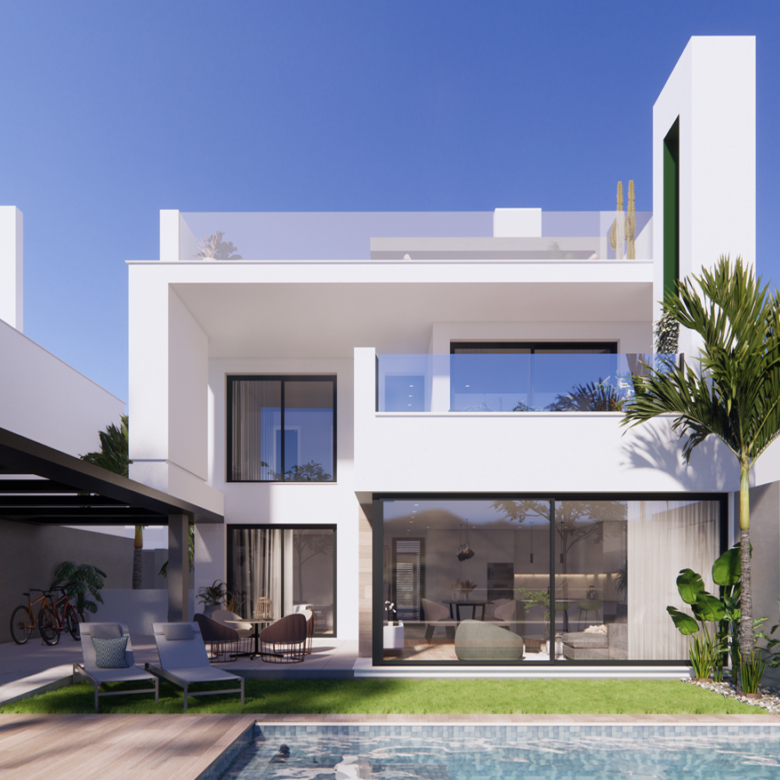 Spaanse DroomCasa presenteert u deze vrijstaande design duplex villa met drie slaapkamers, drie luxe badkamers, souterrain, solarium en privé zwembad. De ruime U-vormige open keuken met eetbar is voorzien van witgoed en loopt naadloos over in de woonkamer. Dit zorgt voor een ruimtelijke sfeer in uw villa. De kleur van de keukenfronten, tegelsoort, werkblad en merk van het witgoed kunt u zelf kiezen. Naast de keuken heeft u de beschikking over een ruime afgesloten wasruimte met plaats voor uw wasmachine en droger. Vanuit de woonkamer heeft u zicht op uw privé zwembad.