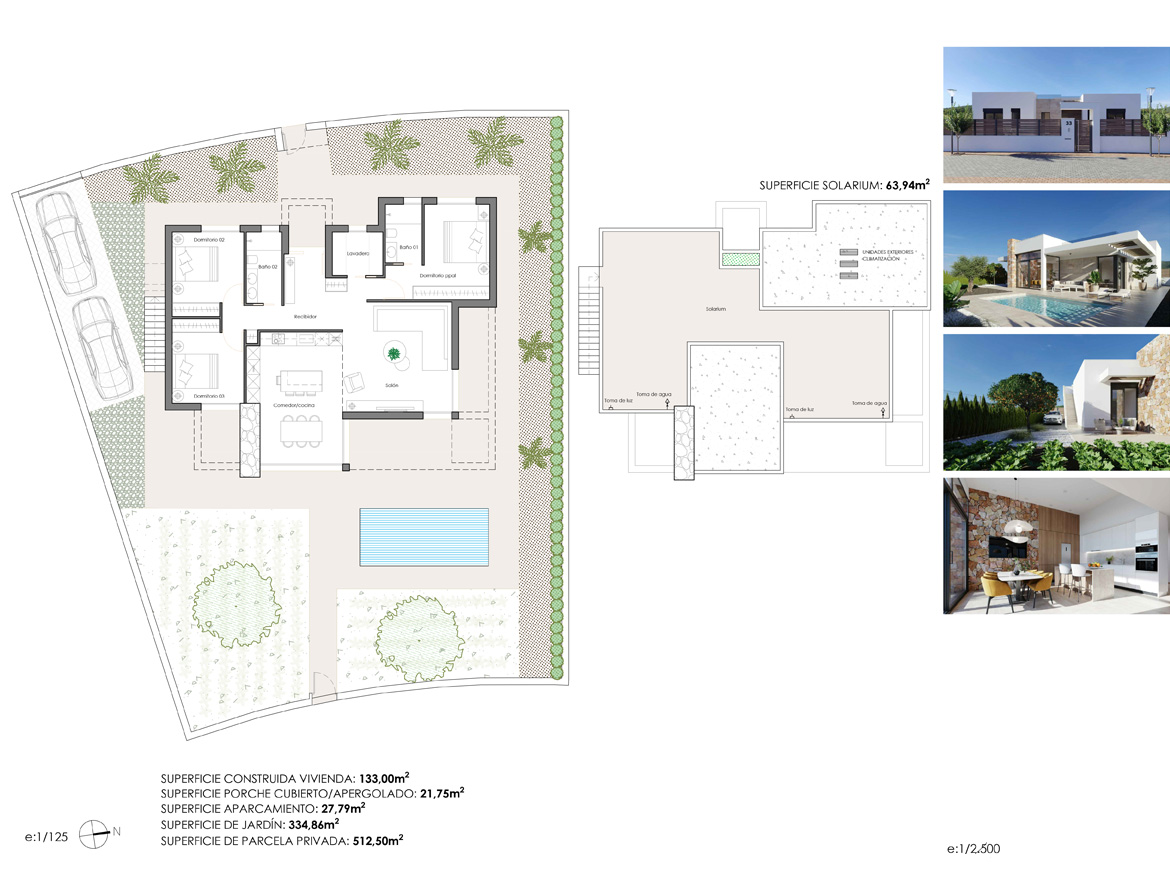 De villa is voorzien van pre-installatie voor airconditioning met verwarmingsfunctie en moderne LED-verlichting zowel binnen als buiten. U kunt uw auto parkeren op uw perceel.